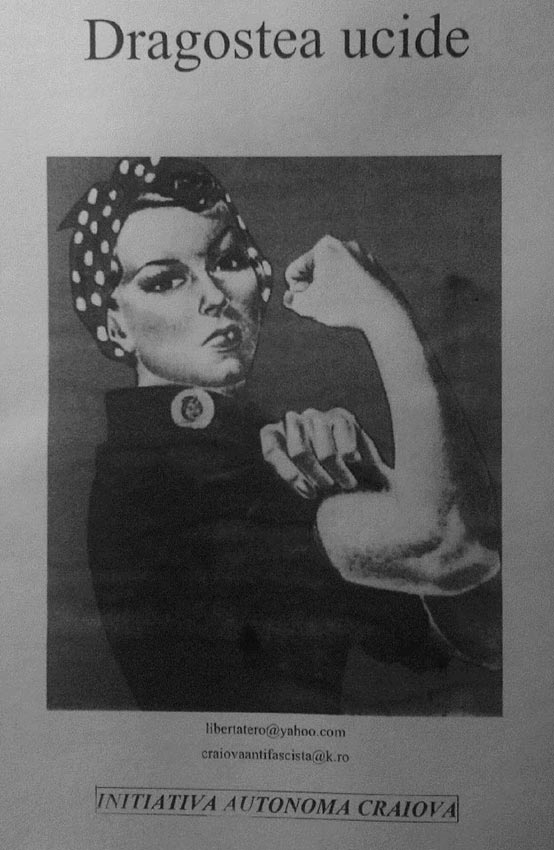 For example the feminism nowadays in Romania is much related to the Orthodox Church and goes hand in hand with orthodox-Christian morality. By this logic, it is obviously undermining women’s reproductive rights, rights that have been regained in the beginning of 90s, after decades of dictatorship. It is also urging the woman to piously submit to the patriarchal pattern of family (absolute value of Romanian society). The emancipated woman for these feminists is the manager / politician / president woman with a major focus on orthodox affinity. We are of course opposing such emancipation since we are calling for boycotting the elections and fighting against any sort of hierarchical structure. The third wave is very little represented in the Romanian context.